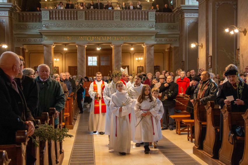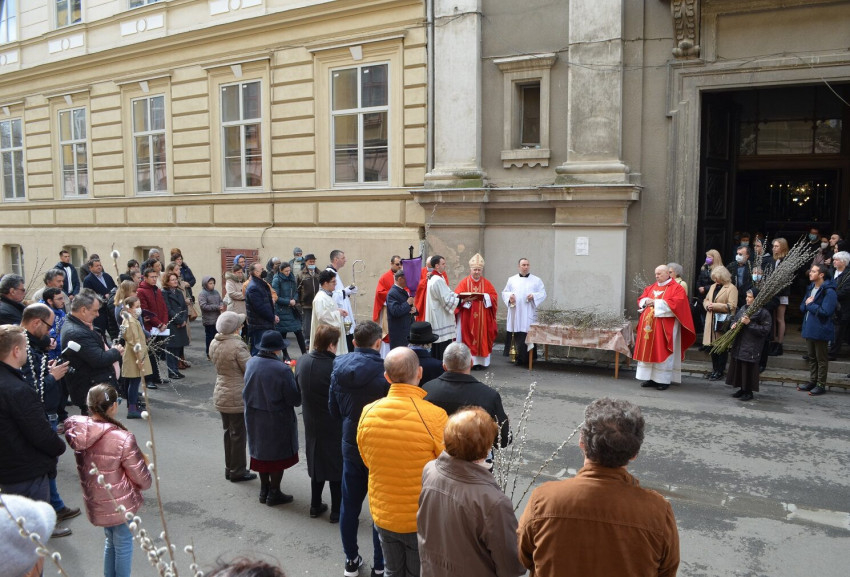 A szatmári egyházmegye Urunk mennybemenetele székesegyházában Schönberger Jenő megyéspüspök mutatott be virágvasárnap szentmisét, melynek keretében megszentelte a székesegyház bejáratához készített barkaágakat.