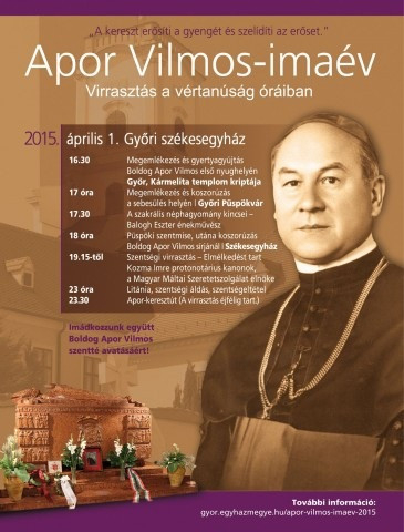 A program április 1-jén délután fél 5-kor gyertyagyújtással kezdődik a győri kármelita templom kriptájában, Boldog Apor Vilmos első nyughelyén. Ezt követően, 5 órakor a püspökvár kertjében található emléktáblánál helyeznek el koszorút.