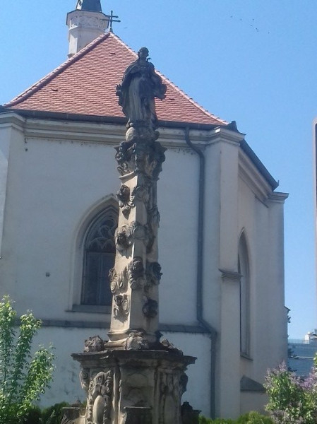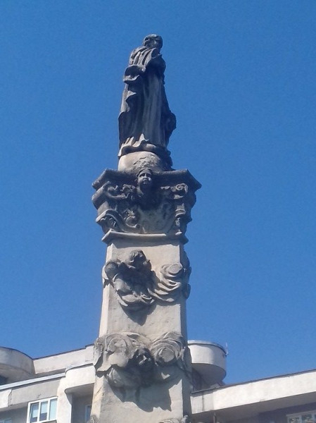 A másik, a pestisjárványhoz kapcsolódó emlékmű a Mária-szobor, amely Erdély második legrégibb köztéri szobra, Kolozsvár legrégebbi szobra. Ma elrejtve, a tömbházrengetegben elveszve, a szentpéteri templom mögötti zöldövezeti részben áll. Gergely Balázs városi tanácsos úgy ítéli meg, hogy az egyházi vezetés közbenjárására kerülhetett az akkor védettnek számító helyre, ezt azonban nem kell lebecsülni, mert – bár ma méltatlannak ítéljük – így menekült meg az oszlop. Amikor készült, amikor állíttatták, nagy becsben állt, fogadalmi szoborként készült; a pestisjárvány elmúltakor, 1744-ben Kornis Antal főkormányszéki tanácsos és felesége, Petki Anna állíttatta saját költségén, hálaadományként. Az osztrák Anton Schuchbauer szobrászművész alkotása. Az oszlop tetején egy Mária-szobor áll, innen a neve: Mária-oszlop. A barokk stílusú fogadalmi szobor eredetileg a piarista templom előtti téren, a Beltorda (ma Egyetem) és Farkas (ma Kogălniceanu) utcák találkozásánál állt; az 1950-es években ideológiai megfontolásokból eltávolították onnan. A kommunista érában „zavaróan” hatott az egyetem előtt‚ a közlekedést is akadályozta‚ így – 1957-ben történt szakszerű restaurálás után – 1959-ben szétszedték, és a ferences templomban raktározták. Talapzata hónapokig a temető bejáratától jobbra lévő fás‚ ráccsal övezett utcai virágágyásokban hevert szétszedve.