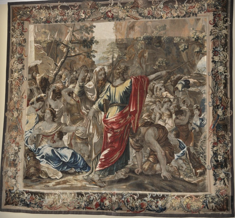 A pécsi püspöki palota falikárpitjai Brüsszelben készültek a 17. század végén, erre a városjegy utal a műtárgyak sarkában – a vizsgálatok azt is igazolták, hogy a városjegy nem utólagos kiegészítés. A próféta életét feldolgozó sorozat darabjai a következők: Mózes a fáraó előtt, Mózes átvezeti népét a Vörös-tengeren, Mózes harca az amalekitákkal, Mózes vizet fakaszt a sziklából, Mózes az égő csipkebokor előtt, Mózes vizet merít, és megitatja Jetro főpap juhait. A barokk korszakban különösen kedvelték a Mózes életéből összeállított sorozatokat; a legismertebbet ezek közül Nicolas Poussin készítette. Ritka azonban, hogy egy falikárpit-sorozat teljes egészében fennmaradjon: a pécsi Mózes-ciklus kiemelkedő jelentőségű, mert Magyarországon az egyetlen hat darabból álló, ép kárpitsorozat.