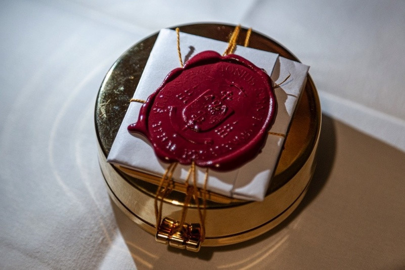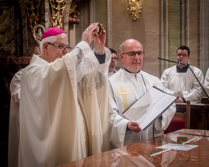 A fiatalok szavalata és a világi elnök gondolatai után Mórocz Tamás plébános köszöntötte a megyéspüspököt: „A főpásztor nem jött üres kézzel. Régóta mondogattuk, sokan kérdezték, vajon mi lesz az a különleges ajándék, amit elhoz, hogy új hangsúlyt adjon itt a Bodajki Szent Szűz tiszteletében. Nagy öröm számunkra, hogy Szent István király koponyaereklyéjéből kap egy töredéket Bodajk, amelyet az új szembemiséző oltárba helyezünk el. A szent király aláírását gravíroztattuk az oltárkőbe, amely megerősíti az oltárcsóknál a papokban és az ideérkező zarándokok tiszteletében, hogy Szent István nemcsak ezer éve volt itt, hanem most is velünk van” – jelentette be a rendkívüli eseményt a plébános.