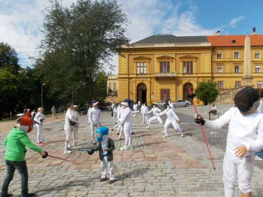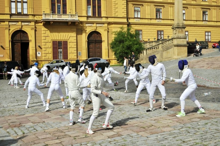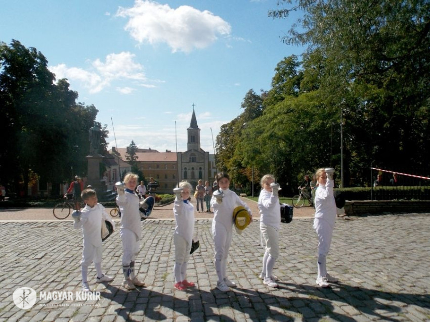 A Dóm téren fél 11-kor kezdődött a flashmob, az úgynevezett „Fencingmob” amelyen a PEAC-os vívók – kicsiktől az idősekig – beöltözve tartottak bemutatót – tájékoztat a Pécsi Egyházmegye.