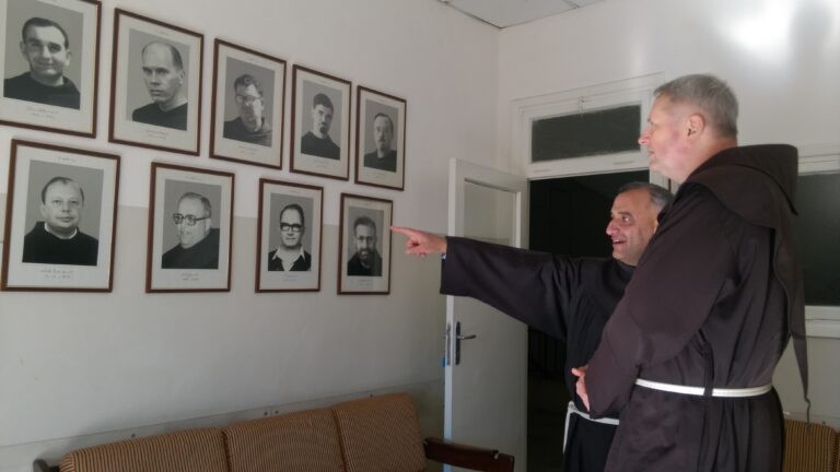 Rasíd régi ferencesek fényképét mutatja az iroda emlékfalán. Az 1948-as háború miatt sok olyan család menekült ide, akiknek a gyerekei a ferencesek jeruzsálemi iskolájába jártak, amely a frontvonalba került, és bezárt. Onnan három ferences eljött ide, és iskolát nyitott, „hogy ne veszítsenek évet a gyerekek”. Így lett Amman is a „Szentföld” része…