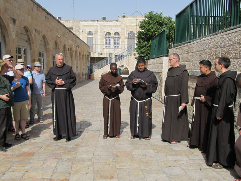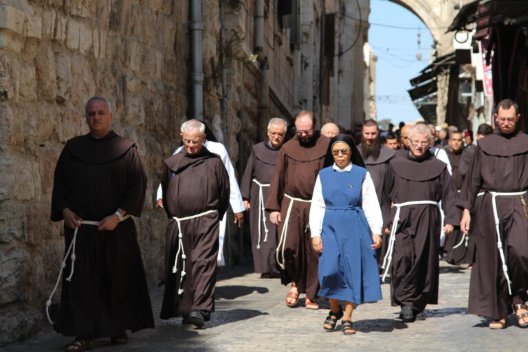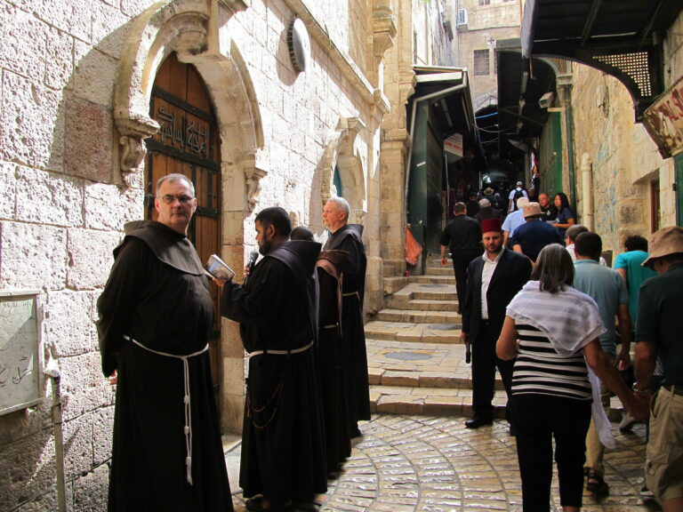 A jeruzsálemi katolikusok és az éppen ott lévő zarándokok pénteken 3 órakor végzik közösen a keresztutat. Az utcán vonuló ferences barátok és a velük imádkozó színes csapat gyakori fotótéma. Előtte 10 perccel gyülekezünk a San Salvatore portájánál, azután már menetben, tempósan megyünk át a Via Dolorosa elejére, ahol az I. stáció egy muszlim iskola udvarán van. Ahogy ideérkeznek az imádság vezetői, gyorsan körülkérdeznek, hogy lássák, főleg milyen nyelvű zarándokok vannak éppen ott.