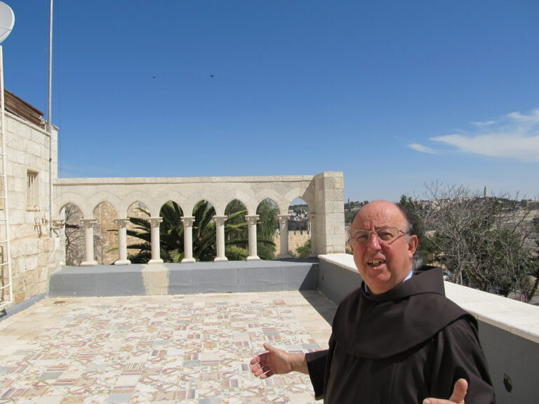 Március 3-án érkeztem az utolsó, bő kéthetes szakaszra Izraelbe. 4-én „megtekintettem” a Christian Information Centre építkezési munkálatait. Felelőse, a mexikói Agustín testvér magyarázza el a koncepciót. Itt, a Jaffai kaputól nem messze, a „Dávid várával” szemben, a régi osztrák postaépületben az eddigi információs központot egy magasabb szintre szeretnék fejleszteni. A földszinten a bejövők első tájékoztatása, könyvárusítás, az emeleten a visitors’ centre a Szent Sír-bazilikához: kisfilmekkel magyarázzák el, amit a helyszínen nem lehet, az építéstörténetet, bibliai hátteret. Fönt a teraszon pedig kávézó épül, ami ragyogó ötlet: fönséges a kilátás, az Óváros ugyanis lejtős, és ez a pont aránylag fent van.