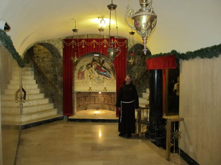 A betlehemi Születés Barlangjának másolata, előtte p. Larry gvardián