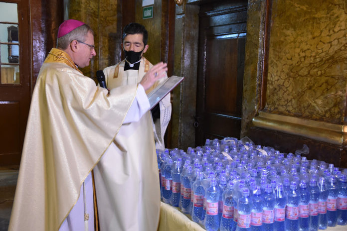 Idén rendkívüli módon történt a vízszentelés: a nap során minden szentmise kezdetén az előkészített és előrecsomagolt flakonokban, illetve zacskókban levő vizet és sót áldották meg. A liturgia végén a hívek a templom kijáratánál vehették át a szentelményt.