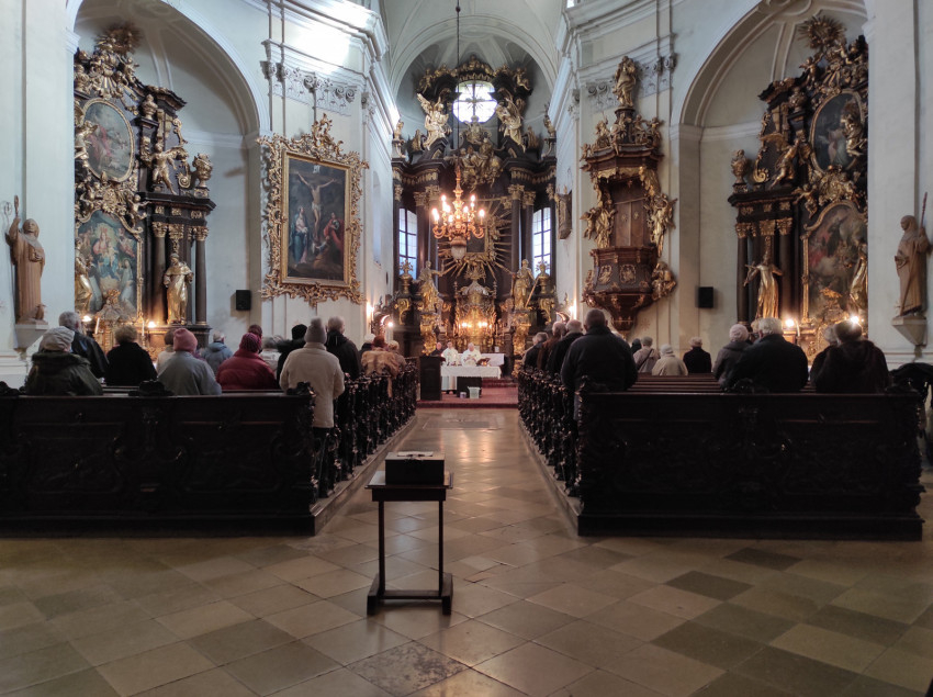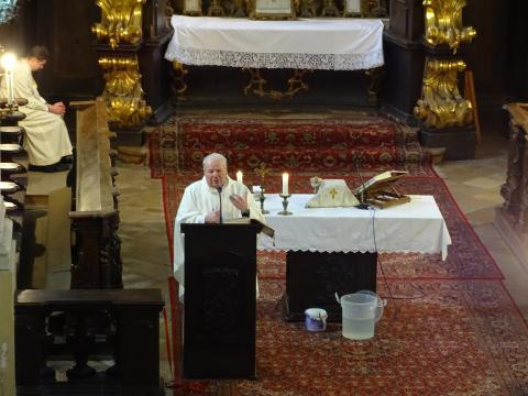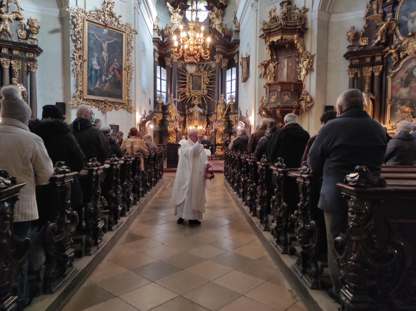A szentmise elején Mail József címzetes apát megáldotta szenteltvízzel a jelenlévőket és a templombelsőt.
