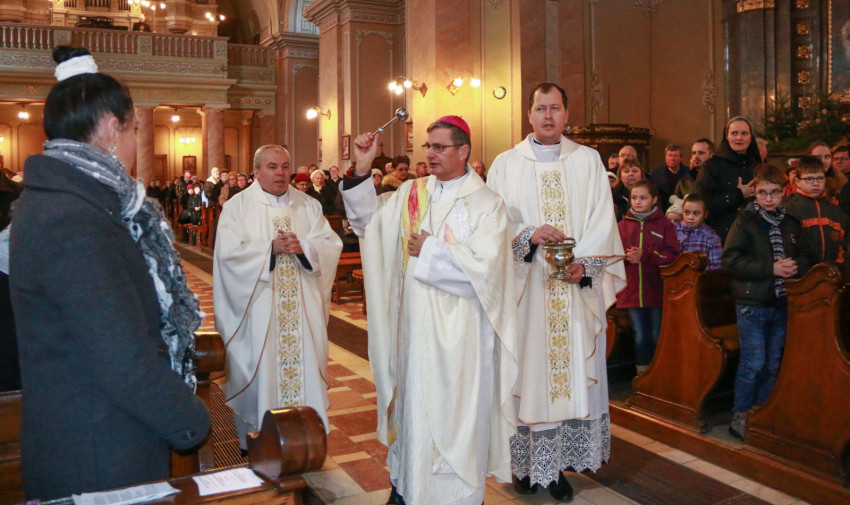 Schönberger Jenő megyéspüspök a bevonulást követően asszisztenciájával a jobb oldali mellékoltárnál elhelyezett vizet tartalmazó edényhez vonult. Mielőtt megáldotta volna a sót és belehintette volna a vízbe, az ünnep történetéről, üzeneteiről beszélt, illetve a vízkereszthez kötődő vízszentelés hagyományáról. Kiemelte, hogy a szenteltvíz, mint szentelmény, áldásközvetítő. A hívek, akik magukkal viszik, a hétköznapokban is meríthetnek Isten kegyelméből, áldásából.