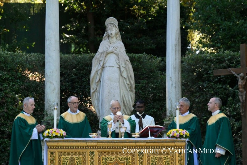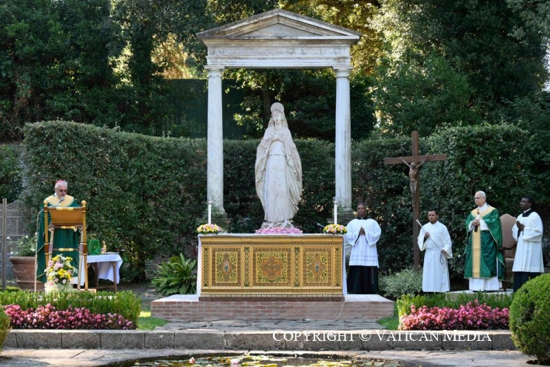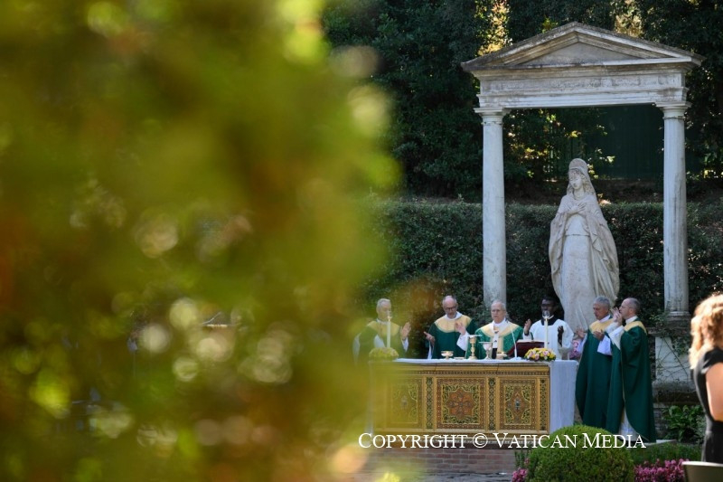 Mindezek elmondása után, van egy homíliám is, melyet előkészítettem és meg fogok osztani, csak egy kis türelmet kérek: van itt néhány elem, melyek valóban segítenek folytatni ezt a délelőtti elmélkedést, megosztva ezt a családias és derűs pillanatot egy olyan világban, amely ég, mind a globális felmelegedés, mind a fegyveres konfliktusok miatt, amik oly időszerűvé teszik Ferenc pápa Laudato si’ és Fratelli tutti kezdetű enciklikáinak üzenetét.