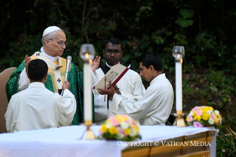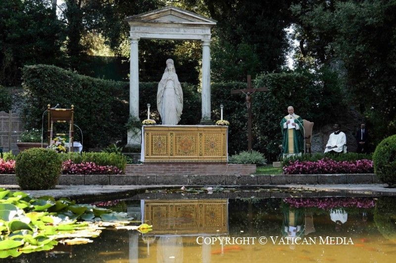 Ezen a szép napon mindenekelőtt arra szeretnék hívni mindenkit, kezdve magammal, hogy éljük meg azt, amit mondhatni egy „természetes” székesegyház szépségében ünneplünk, a növényekkel és a teremtés oly sok elemével, melyek ide hoztak bennünket, hogy az eucharisztiát ünnepeljük, melynek jelentése: ’hálaadás az Úrnak’.