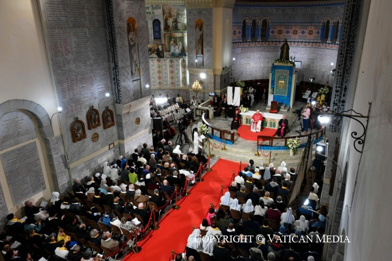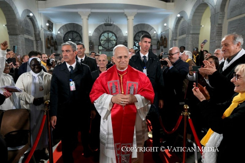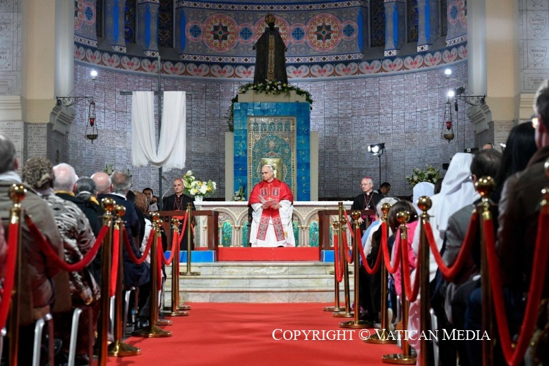 Ennek jele – amint Őeminenciája emlékeztetett rá – maga ez a bazilika is, amely az élő kövekből épülő Egyház szimbóluma, ahol az Afrikai Miasszonyunk oltalma alatt közösség épül keresztények és muszlimok között. Itt Lalla Meryem (Szűz Mária) anyai szeretete mindnyájukat gyermekeiként gyűjti egybe, mindegyiküket saját különbözőségének gazdagságával, és akiket ugyanaz a vágy, a méltóság, a szeretet, az igazságosság és a béke iránti vágy egyesít. Ők olyan gyermekek, akik együtt akarnak előrehaladni, élni, imádkozni, dolgozni és álmodni, egy olyan hitben, amely nem elszigetel, hanem megnyit, nem összezavar, hanem egyesít, közel hoz anélkül, hogy egyformává tenne, és valódi testvériséget hoz létre, amint azt Monia mondta, és amint Rakel tanúságot tett róla, megosztva a Tlemcen Fellowship keretében szerzett tapasztalatát. Egy olyan világban, ahol a megosztottságok és háborúk fájdalmat és halált visznek a nemzetek közötti kapcsolatokba, a közösségekbe, sőt még a családokba is, a ti egységben és békében megélt életetek nagy jel.
