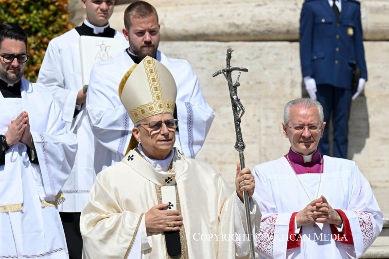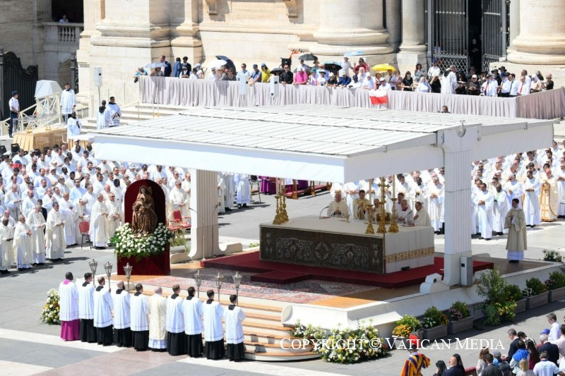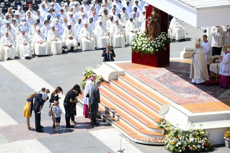 És még egy utolsó dolgot szeretnék hozzátenni. Isten Fiának imája, mely reményt ad nekünk az úton, arra is emlékeztet bennünket, hogy egy napon mindannyian uno unum leszünk (vö. Szent Ágoston: Zsoltármagyarázatok, 127): egyek az egyetlen Megváltóban, akiket Isten örök szeretete ölel át. Nemcsak mi, hanem azok az apák és anyák, nagymamák és nagypapák, fivérek, nővérek és gyermekek is, akik előttünk járnak az ő örök húsvétjának fényében, és akikről úgy érezzük, itt vannak velünk ebben az ünnepi pillanatban.