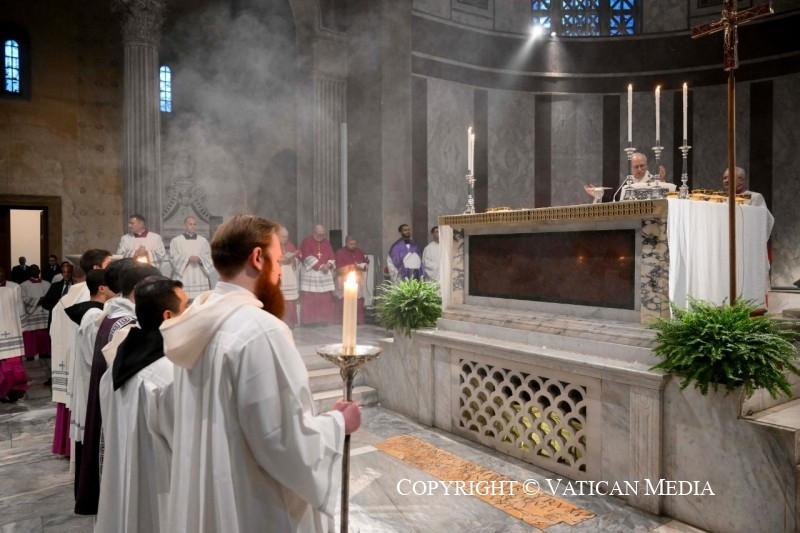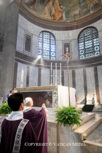 „Hol van hát Istenetek?” – kérdezik a népek. Igen, kedves testvéreim, ezt kérdezi tőlünk a történelem, de azt megelőzően a lelkiismeretünk: nevezzük nevén a halált, hordozzuk magunkon a jeleit, de tegyünk tanúságot a feltámadásról! Bűneink felismerése, hogy megtérjünk, már a feltámadás előjele és róla való tanúságtétel: azt jelenti ugyanis, hogy nem maradunk a hamuban, hanem felállunk és újjáépítünk. Akkor a húsvéti szent háromnap, melyet majd nagyböjti utunk csúcspontján ünneplünk, feltárja teljes szépségét és jelentését. Úgy teszi ezt, hogy a bűnbánat által bevon bennünket az átmenetbe a halálból az életre, a tehetetlenségből Isten lehetőségeibe.