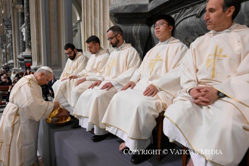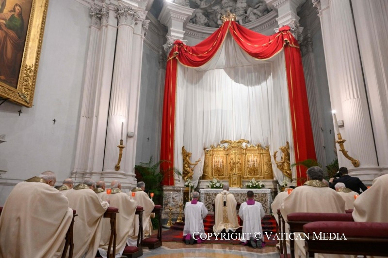 A ma esti ünnepélyes liturgiával belépünk az Úr kínszenvedésének, halálának és feltámadásának szent háromnapjába. E küszöböt nem nézőként, és nem megszokásból lépjük át, hanem Jézus maga von be bennünket különleges módon: mint meghívottakat arra a vacsorára, amelyen a kenyér és a bor az üdvösség szentségévé válik számunkra. Egy olyan lakomán veszünk ugyanis részt, amelyen Krisztus – „mivel szerette övéit, akik a világban voltak, mindvégig szerette őket” (Jn 13,1) – szeretete cselekedetté és táplálékká válik mindenki számára, feltárva Isten igazságosságát.