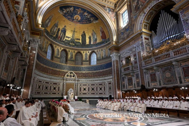 ez olyan „húsvéti lakoma, amelyen Krisztust vesszük magunkhoz, lelkünket kegyelem tölti el, s a jövendő dicsőség záloga nekünk adatik” (Sacrosanctum Concilium liturgikus konstitúció, 47). A püspökökben és a papokban, akik „az új szövetség papjaivá” lettek az Úr parancsa szerint (trentói zsinat: De Missae Sacrificio, 1), az ő Isten egész népe iránti szeretetének jele van jelen, s ezt a népet teljes önátadással kell szolgálnunk, szeretett testvéreim.