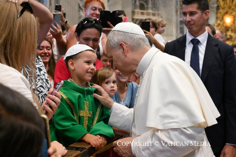 A Szentatya más nyelveken is összefoglalta katekézisét, üdvözölte a jelen lévő híveket, és augusztus 22-re böjti és imanapot hirdetett a békéért. Az általános kihallgatás a Miatyánk elimádkozásával és apostoli áldással zárult, de ezt követően a pápa még köszöntötte a termen kívül várakozókat, és átment a Szent Péter-bazilikába is üdvözölni azokat, akik nem fértek be a VI. Pál terembe, és a kihallgatást kivetítőn követték.