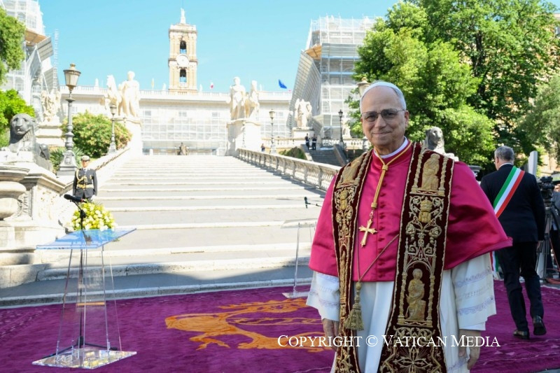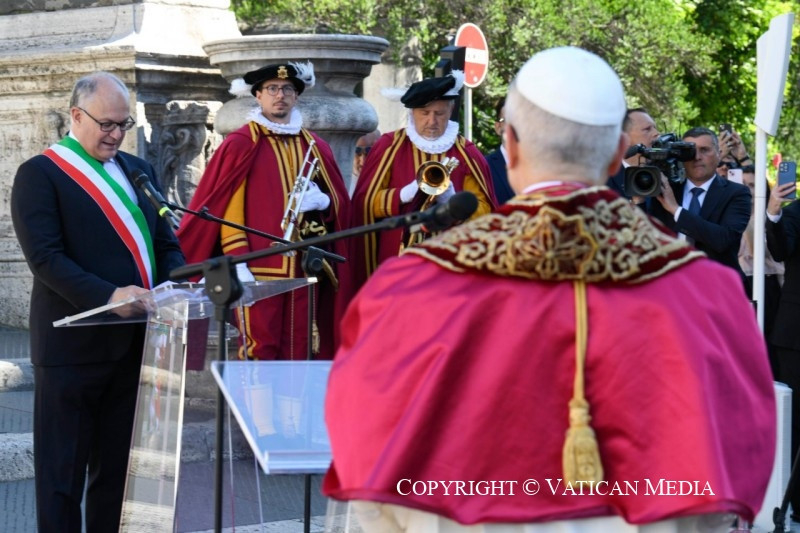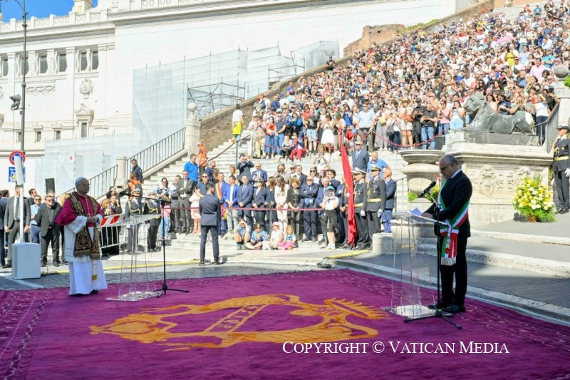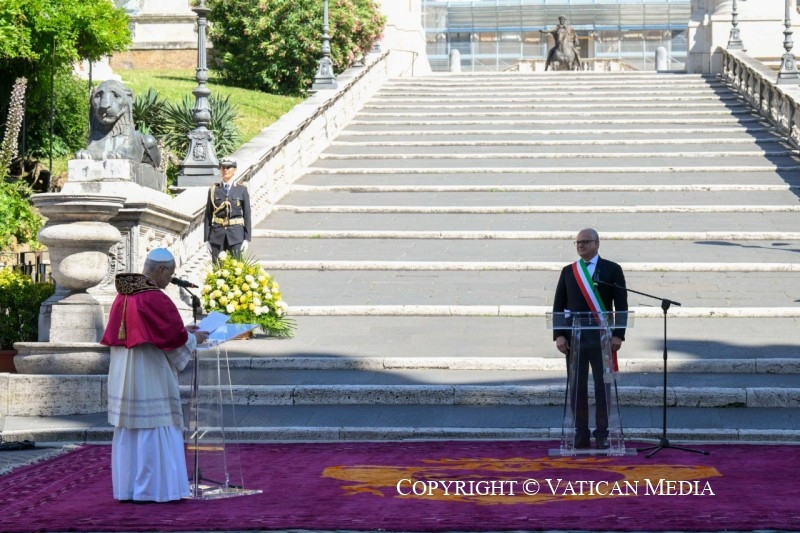Polgármester úr, kívánom, hogy a történelmi és művészeti örökségének gazdagsága miatt páratlan Róma mindig kitűnjön az emberség és civilizáció azon értékeivel is, amelyek az evangéliumból kapják életerejüket. Ezekkel az érzésekkel adok apostoli áldást erre a városra és összes lakójára.