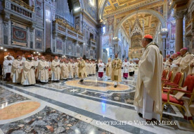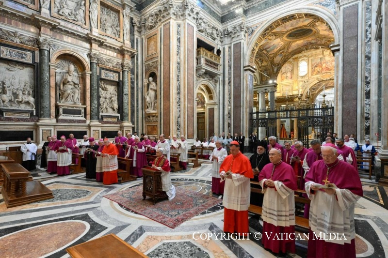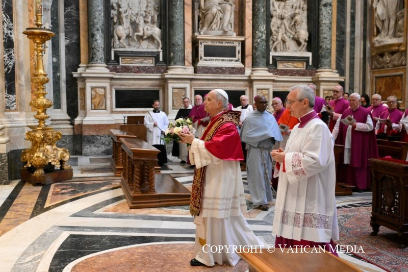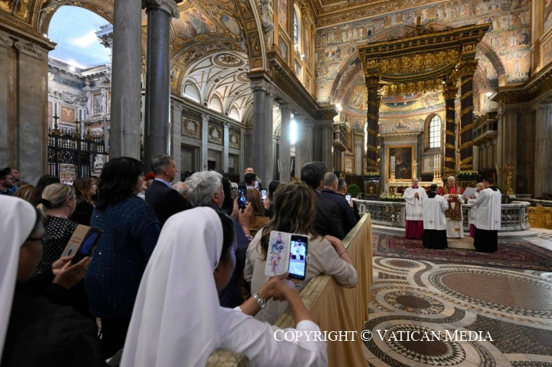 Szeretnék köszönetet mondani mindazoknak, akik ebben a bazilikában dolgoznak, a két bíborosnak, akik ma este kísérnek engem, és annak a sok embernek, akik elkötelezetten segítenek nekünk imádságos, áhítatos életet élni, és mindenekelőtt segítenek közelebb kerülni Jézus anyjához, Isten anyjához, a Boldogságos Szűz Máriához. Ez egy gyönyörű alkalom arra, hogy megújítsuk a Mária, a Salus Popoli Romani iránti áhítatunkat, aki sokszor kísérte a római népet szükségeiben.