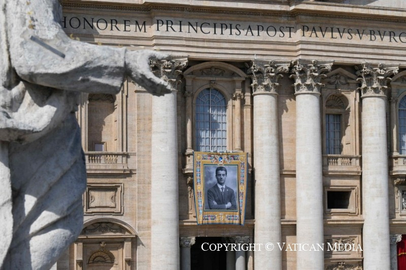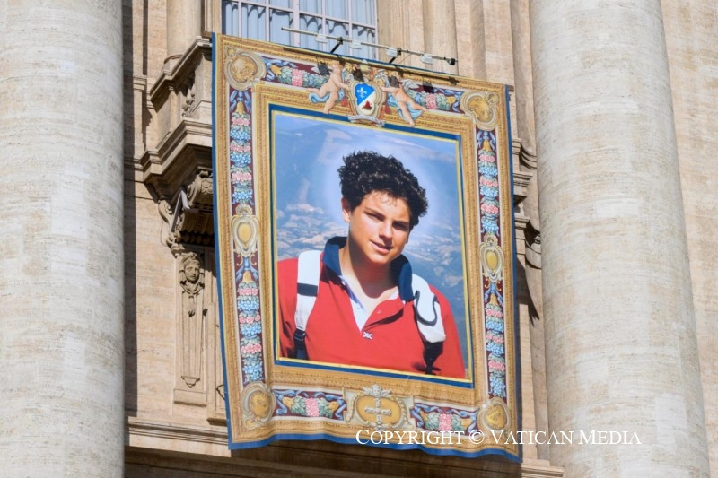 Pier Giorgio élete ma is fényt jelent a világi hívők lelkisége számára. Számára a hit nem magánjellegű áhítat volt: az evangélium erejétől és az egyházi egyesületekhez való tartozástól vezérelve nagylelkűen, elkötelezetten dolgozott a társadalomban, hozzájárult a politikai élethez, és lelkesen szentelte magát a szegények szolgálatának. Carlo pedig a családban találkozott Jézussal, szüleinek, Andreának [András] és Antoniának köszönhetően – akik ma itt vannak két testvérével, Francescával és Michelével –, majd az iskolában, ő is, és különösen a szentségekben, a plébániai közösségben kiszolgáltatott és ünnepelt szentségekben. Úgy nőtt fel, hogy gyermek- és kamaszkorában az imádságot, a sportot, a tanulást és a tevékeny szeretetet természetes módon összekapcsolta mindennapjaiban.