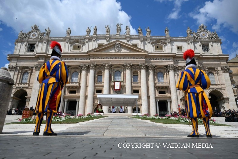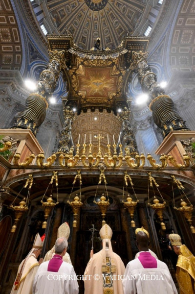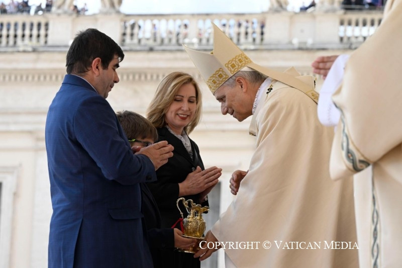 – hangzott az ének, miközben Leó pápa a keleti hierarchákkal együtt lement Péter apostol sírjához, ahol egy-egy tálcán el volt helyezve a pallium, a hozzátartozó szögekkel, és a halászgyűrű. A Szentatya csendben imádkozott, majd a bíborosok hosszú menete elindult a bazilikán át a Szent Péter tér felé. A palliumot és a halászgyűrűt diakónusok az ünnepi körmenet részeként vitték az oltárra.