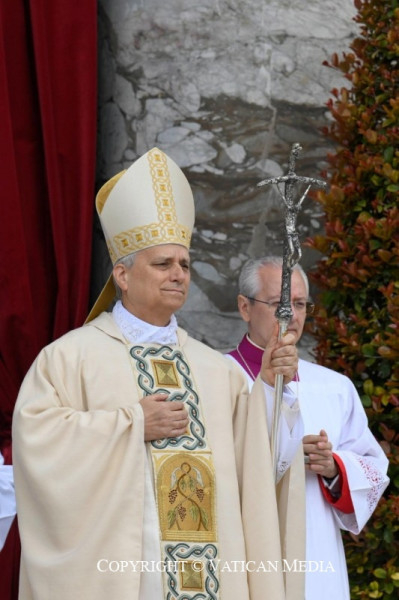Ezt követően a bíborosi kollégium diakónusi rendjének tagja, Dominique Mamberti bíboros (Európa), a testület protodiakónusa (ő hirdette ki az új pápa személyét a megválasztását követően a Szent Péter-bazilika áldások erkélyén – a szerk.), miután fohászkodott az új Szentatyáért, feladta rá a palliumot, majd Diego Ravelli pápai szertartásmester a sebhelyeket jelképező fekete keresztekbe beleillesztette a szögeket. Őt követte a bíborosi kollégium presbiteri kollégiumának a tagja, Fridolin Ambongo Besungu kongói bíboros, kinshasai érsek (Afrika), aki könyörgött XIV. Leó péteri szolgálatáért. Végül a bíborosi kollégium püspöki rendjének tagja, Luis Antonio Tagle bíboros (Ázsia), miután imádkozott az új pápáért, ujjára húzta a halászgyűrűt. XIV. Leó ezt követően láthatóan elérzékenyült, miközben a téren az ünneplők tapsban törtek ki tiszteletük és elismerésük jeléül.