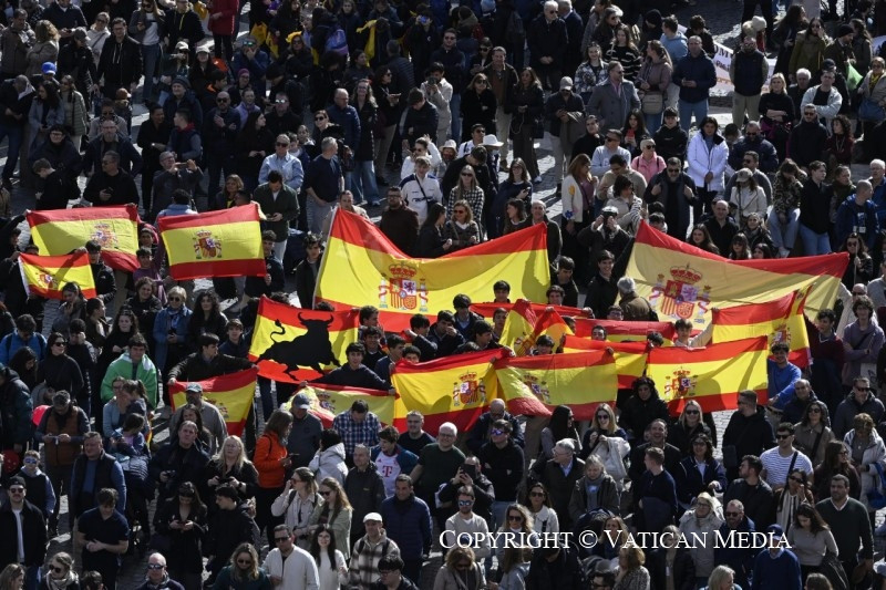 Örömmel köszöntelek mindnyájatokat, rómaiak és zarándokok. Külön is köszöntöm a spanyolországi San Lorenzo de Cadice-plébánia híveit és a Marche tartományból érkezett zarándokokat.