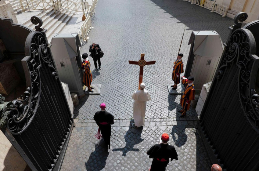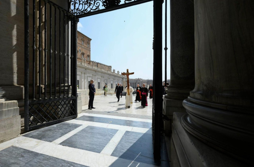 Ezt követően körmenetben vonultak a VI. Pál teremből a Szent Péter-bazilika előtti térre, hogy aztán belépjenek a szent kapun. A körmenet élén a pápa haladt, ő vitte a jubileumi keresztet, őt követték a bíborosok, a püspökök, a papok és a világi személyzet tagjai. A közös együttlét a Szentatya által vezetett koncelebrált szentmisével zárult bazilikában.