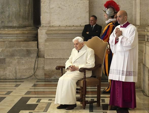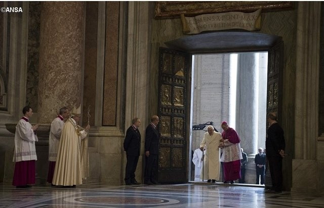 Ferenc pápa után közvetlenül elődje, XVI. Benedek emeritus pápa is belépett a szent kapun, egykori titkára, Georg Gänswein érsek kíséretében. Botjára támaszkodva lépett a küszöbre, majd rövid imádság után belépett a Szent Péter-bazilikába, ahol Ferenc pápa köszöntötte őt, és testvéri kézfogással üdvözölték egymást.