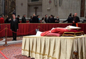 Miután Ferenc pápa meghinti szenteltvízzel és tömjénnel az emeritus pápa földi maradványait, latinul imádkozik:
