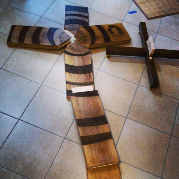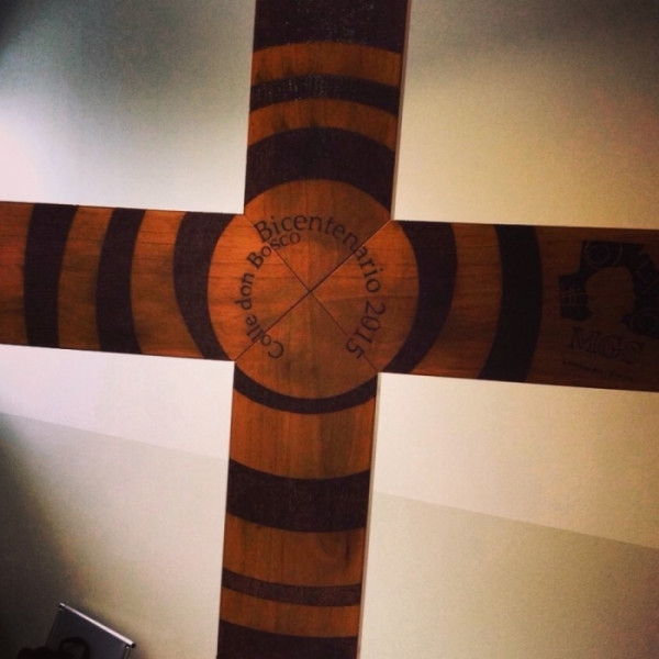 A kereszt öt darabból áll, pirográfia technikával égették rá több szalézi háznak és a Segítő Szűz Mária Leányai házainak nevét. A missziós munka elismeréseként a tartományban az „Amici del Sidamo” kifejezés is olvasható rajta. A keresztet koncentrikus körök díszítik, felirata: „Don Bosco születésének bicentenáriuma – Colle Don Bosco 2015”.