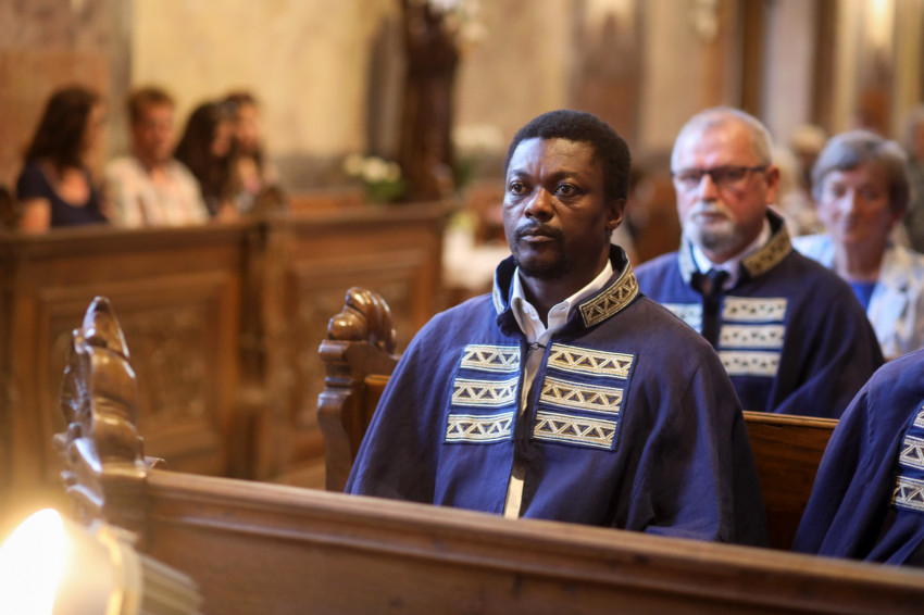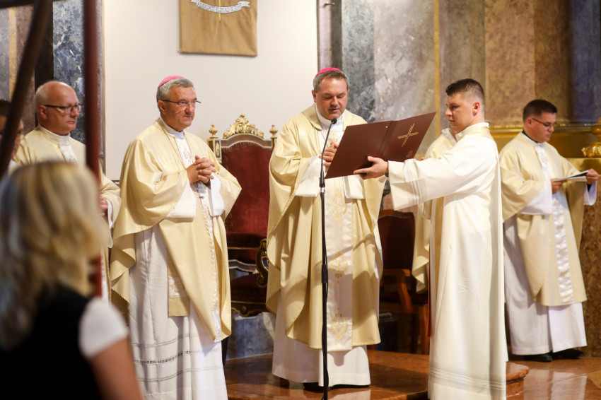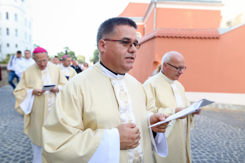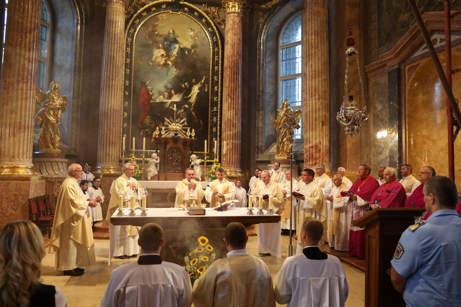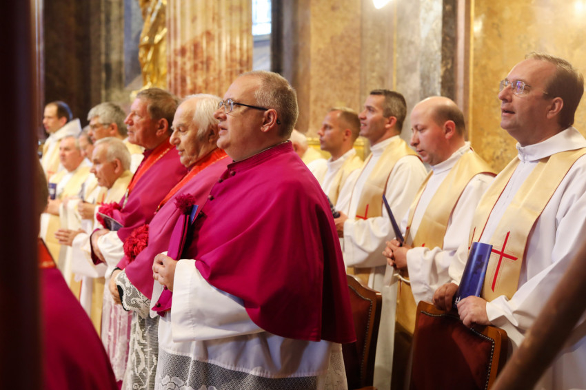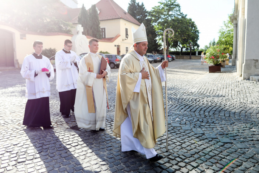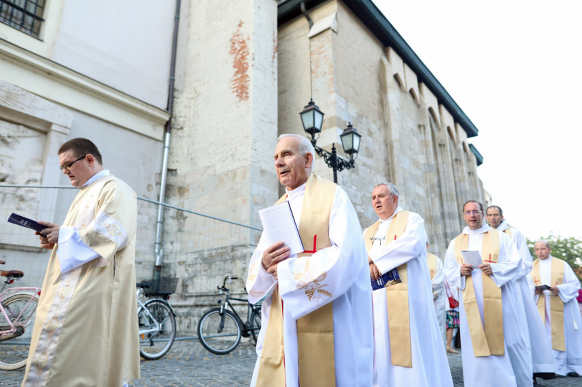 A belülről felállványozott bazilikába hosszú sorban vonult be a szentmise elején a Győri Egyházmegye papsága, a székesegyház székeskáptalanjának kanonokjai, a győri bencés perjelség képviselői és növendékei Sárai-Szabó Kelemen perjellel, valamint a Brenner János Hittudományi Főiskola növendékei.