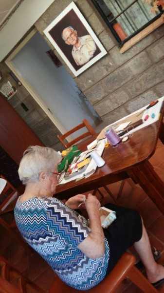 Irma vitt magával tennivalót is otthonról: képeslapokból készít dobozokat, fonallal varrja össze az oldalait. A kis piros bőröndbe kevés ruha fért csak, mert kellett a hely a fonalaknak, képeslapoknak, az ollónak is. Soha nem adja el, amit készít, mindenkinek ajándékba adja: otthon a barátainak, itt a gyerekeknek.