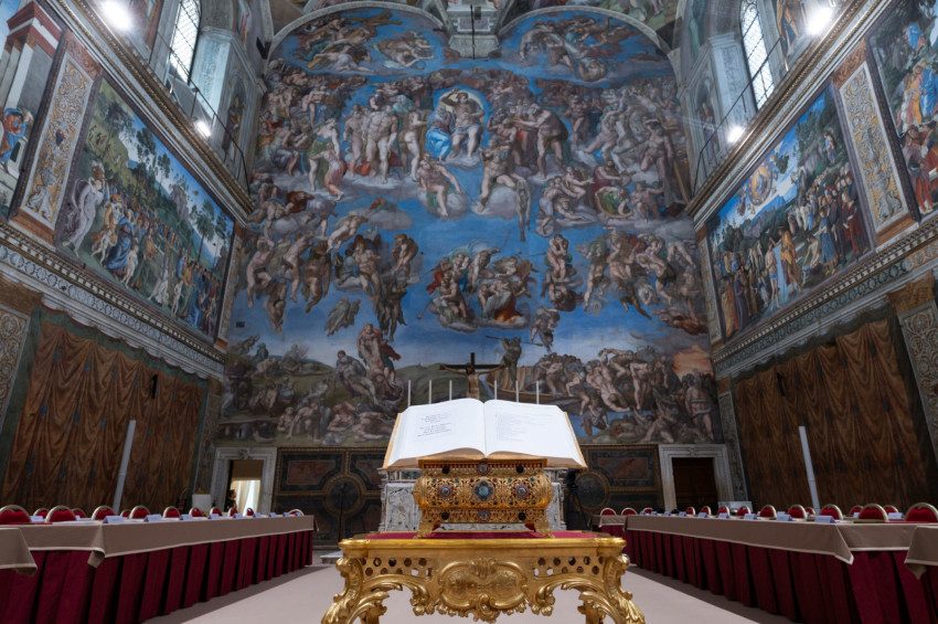 A Vatikáni Média képein látható, hogy a többek között Michelangelo festményeivel díszített kápolna immár előkészítve várja a bíborosokat, akik ma, május 7-én délután itt ülnek össze, hogy titkos szavazás útján megválasszák az új római pápát.