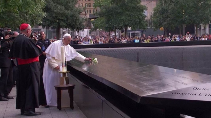 Ferenc pápa imája a Ground Zero emlékhelyen