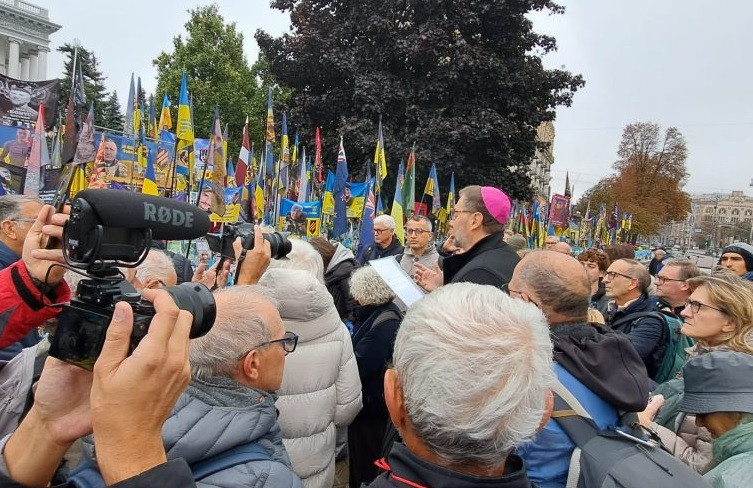 A nagy létszámú olasz csoporthoz szólva, amely a Majdan téren megállt, hogy tisztelegjen a háború áldozatai előtt, a nuncius így fogalmazott: „Szimbolikus helyen vagyunk, imádkozzunk nemcsak az ukrán áldozatokért, hanem az életüket vesztett orosz katonákért és minden háború áldozataiért is. A szentévben egységet alkotunk azokért, akik hisznek az imádságban, és azokért, akik nem hisznek; csendben, hálával a szívünkben gondolunk azokra, akik életüket adták, akik szenvednek más szenvedőkért, és akik ölelnek. Ez az irgalmasság cselekedete”.