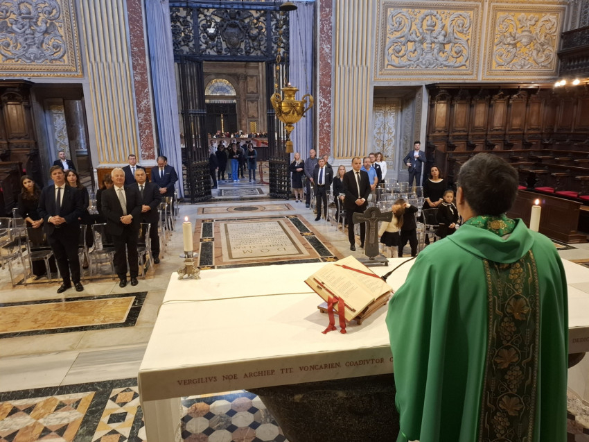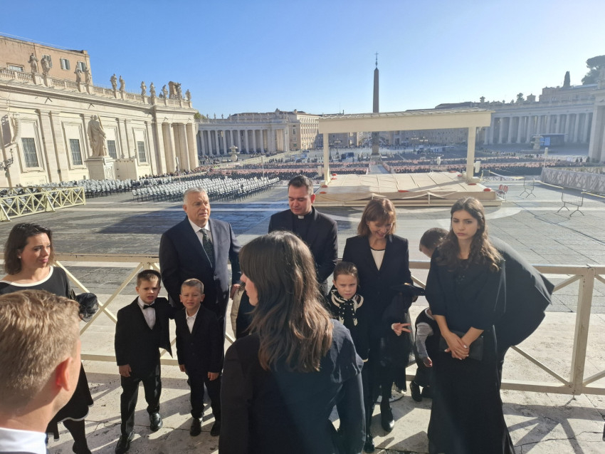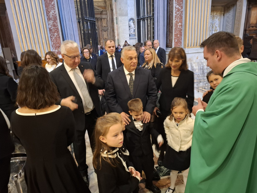 A hétfő reggeli szentmisét az Orbán család kérte, hogy lelkileg készülődjenek a Szentatyával való találkozásra, mint ahogy ezt korábban is tették a korábbi pápáknál tett látogatásaik esetében. Kifejezetten kérték, hogy ne legyen külön, zárt körű szentmise, hanem az egyik szokásos reggeli, olasz nyelvű szentmisébe kapcsolódnának be a bazilikában. Jorge Romero argentin szerzetes pap volt éppen szolgálattevő a Szeplőtelen Fogantatás Fiai kongregációból, aki olasz nyelven celebrálta a szentmisét. A napi olvasmány nyomán Pál szavait értelmezte, aki a Galatáknak írt levélben arról tanít, hogy „nem a szolgaság lelkét kaptátok, hogy továbbra is félelemben éljetek, hanem a fogadott fiúság Lelkét nyertétek el, általa szólítjuk őt így: Abba, Atya”. Ez az istengyermekség ajándéka, melyet a keresztségben kapunk – szólt az argentin atya, majd megkérdezte, hogyan mondják magyarul azt, hogy „istengyermekség”, és szépen, többször is megismételte a szót magyarul.