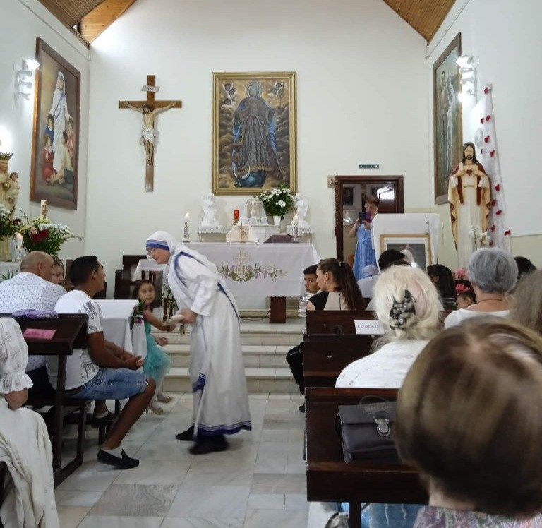 Vida Izabella önkéntes és egy roma kislány ajándékot adott át az egyházi elöljárónak: egy áldoztató kelyhet ábrázoló emléklapot, amelyet a gyermekek készítettek; a kép hátára a szerzetesnővérek angol nyelvű megemlékező szövege is rákerült.