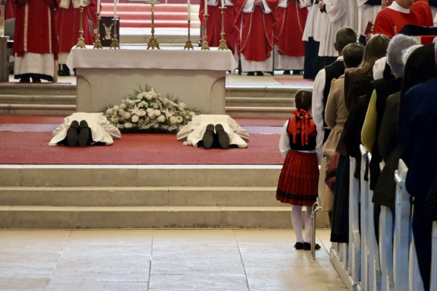 A homília után a jelöltek elmondták szentelési ígéreteiket, majd tiszteletet és engedelmességet fogadtak a mindenkori főpásztornak. Ezt követően, a teljes átadás jeleként földre borultak, miközben a Mindenszentek litániáját imádkozva a jelenlévők – köztük családtagok, rokonok, barátok és ismerősök – a gyulafehérvári székesegyházban a szentek közbenjárását kérték a jelöltekért.