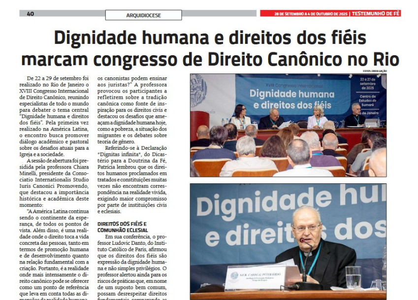 A brazíliai Testemunho de Fé (A Hit Tanúságtétele) című katolikus hetilap kiemelt figyelmet szentelt a Rio de Janeiróban megrendezett 18. Nemzetközi Kánonjogi Kongresszusnak, amelyen Erdő Péter bíboros, prímás tartotta a nyitó előadást.
