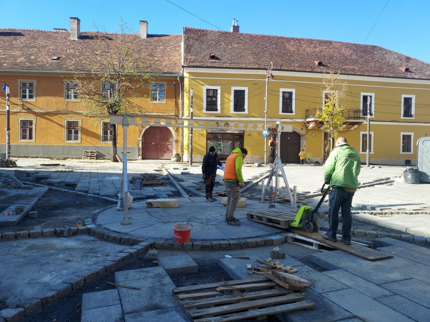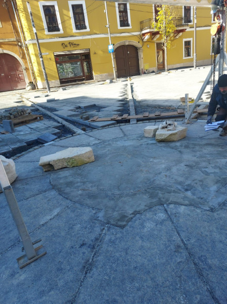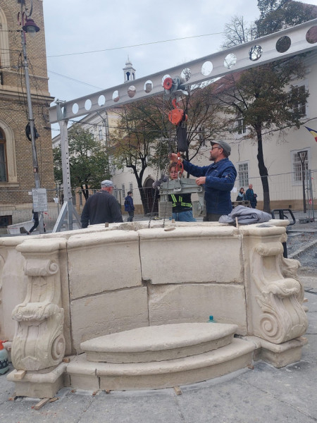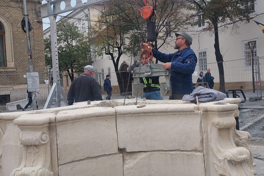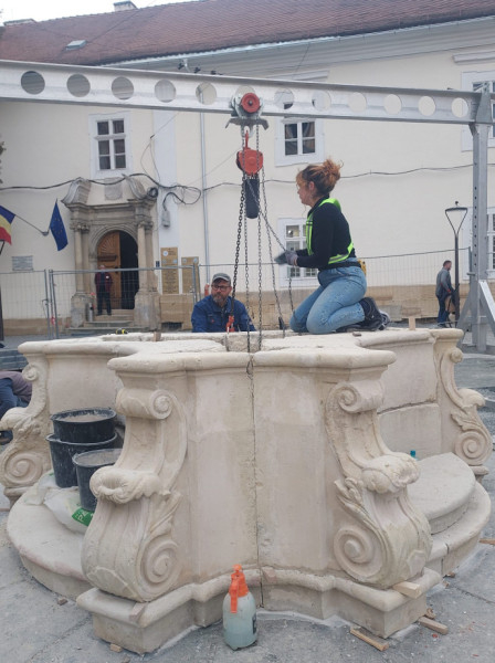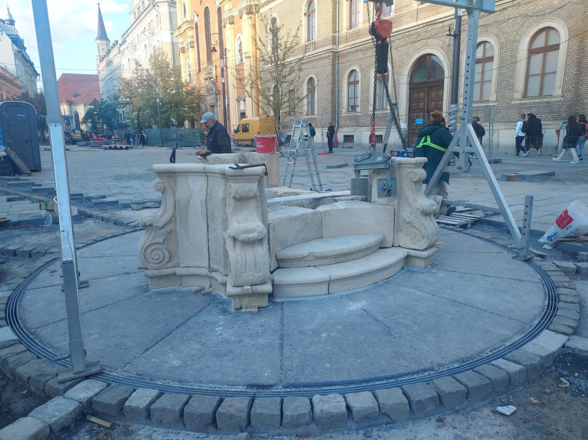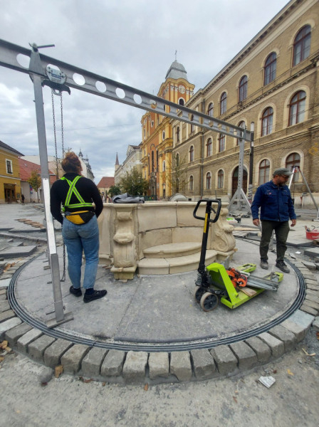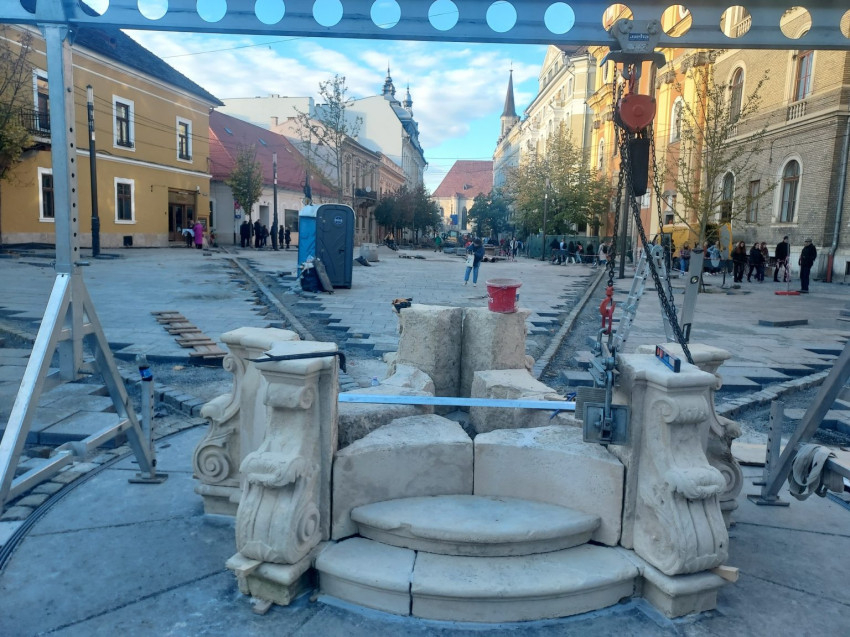 Kis Zoltán kőrestaurátor és csapata (Sipos István, Bede Izabella, André Csongor) november 1-jén elkezdte a munkát: a restaurált, illetve újra kifaragott daraboknak a helyszínre, helyükre elhelyezése, összerakása, megerősítése. A talapzatra kerül majd a főpárkány, az angyalkákkal díszített kőoszlop, ennek tetejére pedig a Mária-szobor, amely a Szent Mihály-templomra fog nézni.