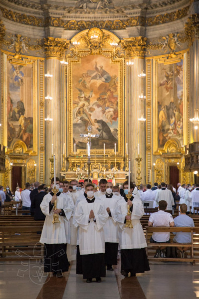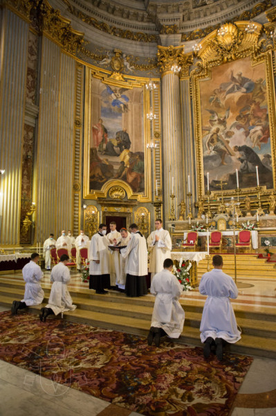 A szentelést megelőzően a földre boruló szentelendők fölött elimádkozták a Mindenszentek litániáját, benne a sajátos kéréssel: „Szent Ignác atyánk” is könyörögjön a kollégium diákjaiért. E kérés Szent Ignác életének egyik jelentős eseményéhez kapcsolódik, amelyet a Szent Ignác-templom főoltárképe is ábrázol: 1537-ben Velencéből Rómába indult társaival, hogy a római pápa szolgálatára álljanak. A Róma északi határában álló La Storta kicsi kápolnájában megjelent neki a keresztjét hordozó Krisztus, aki a zarándok Ignácot és társait Mennyei Atyja oltalmába ajánlotta, és e szavakkal erősítette meg őket: Ego vobis Romae propitius ero, vagyis „Rómában kegyes leszek hozzátok.”