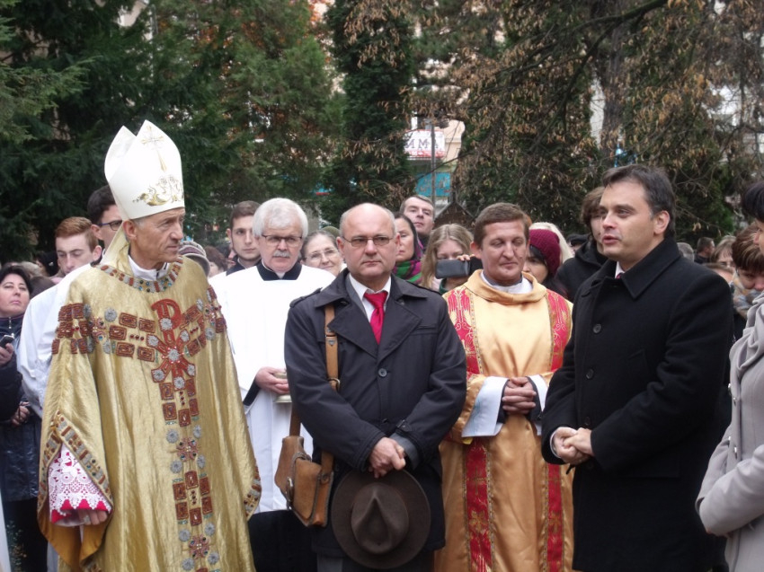A szentmise elején Snep Román munkácsi plébános köszöntötte a megjelenteket: Mieczysław Mokrzycki lembergi érseket, az Ukrajnai Római Katolikus Püspöki Konferencia elnökét, a szentmise főcelebránsát, Nil Luscsák munkácsi görögkatolikus segédpüspököt, valamint Soltész Miklós és Latorcai Csaba államtitkárokat, Andrij Baloga polgármestert és Nuszer Ernő képviselőt.
