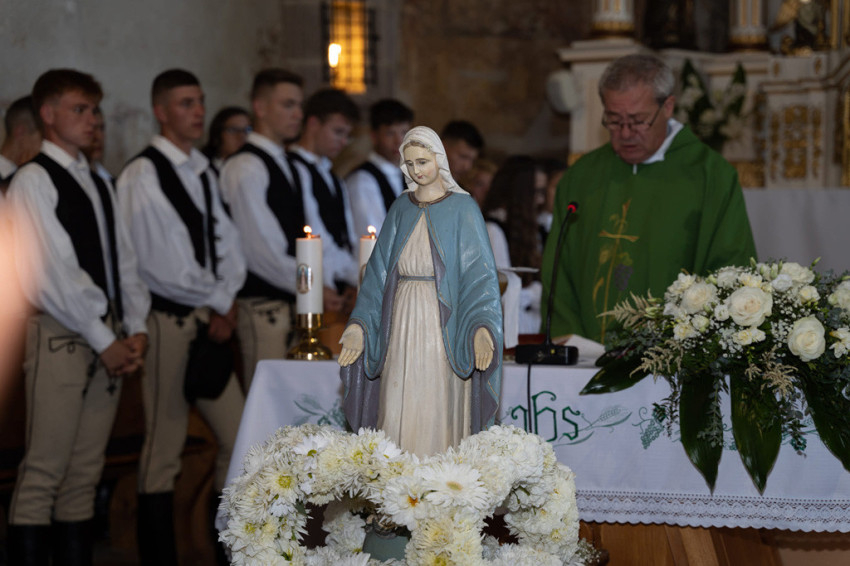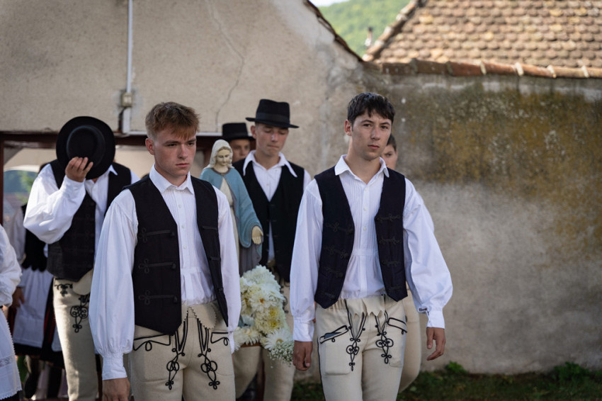 A kis szobrot négy fiú vitte a templomba, őket pedig – a Szűzanya tizenkét csillagból álló koronáját jelképezve – jobbról és balról hat fiú és hat lány gyertyával kísérte, kis mécsessel a kezükben. A virágkoronát két lány vitte a templomba.