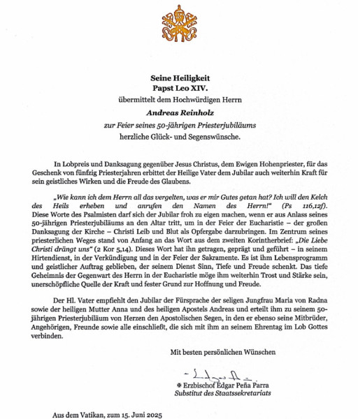 „XIV. Leó pápa legmelegebb üdvözletét és áldását küldi Andreas Reinholz plébánosnak papi szolgálata 50. évfordulója alkalmából. Urunkat, Jézus Krisztust, az Örök Főpapot dicsőítve és hálát adva az ötvenéves papság ajándékáért, a Szentatya további erőt kíván a jubilánsnak lelki szolgálatához és a hit öröméhez. »Mivel viszonozzam az Úrnak, ami jót tett velem? Veszem az üdvösség kelyhét, és segítségül hívom az Úr nevét!« (Zsolt 116,12f) A jubiláns örömmel érezheti magáénak a zsoltárosnak ezeket a szavait, amikor 50 éves papi jubileuma alkalmából az oltárhoz járul, hogy Krisztus testét és vérét áldozatként felajánlja az Eucharisztia – az Egyház nagy hálaadása – ünneplésében.