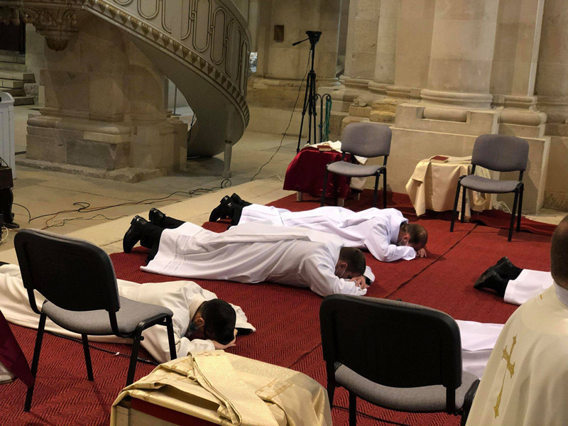 Az ígéretek kinyilvánítása után következett a Mindenszentek litániája, amelynek imádkozása alatt a jelöltek a teljes önátadás jeleként arccal a földre borultak, kifejezve azt, hogy életüket teljesen Isten kezébe helyezve vállalják a szent szolgálatot.