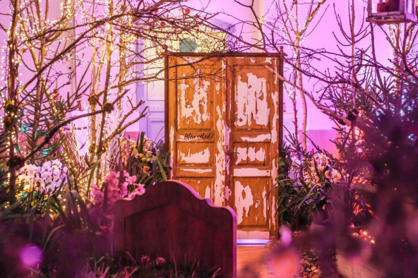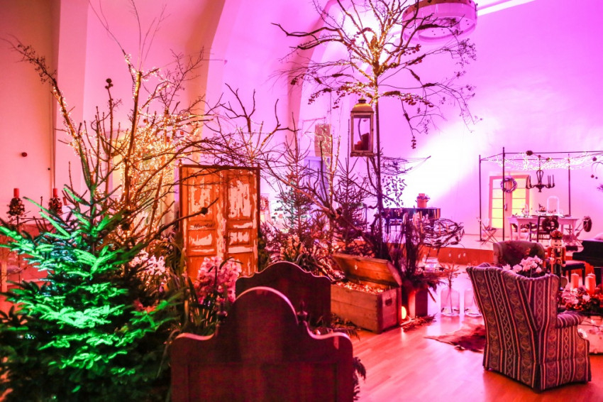 Megnézzük az adventi kiállítást, amelyet immár tizenegyedik alkalommal rendezett meg Kruchió László a monori Vigadóban. Oly sok embert vonz, hogy idén alig fértünk be a megnyitón. Évről évre más téma köré szerveződnek a kompozíciók, és különféle társkiállítók érkeznek: tavalyelőtt Petrás Mária dalai és kerámiái, idén Anka Margó kerámiái és rajzai járultak hozzá a varázslathoz. A sok hatalmas, különleges adventi koszorú mellett a kompozíciókban régi tárgyak, bútorok is helyet kapnak. Tavaly Erzsi néni régi faajtói és utazóládája köszöntek rám, életre keltve a kerekesszékben élt, hét nyelven beszélő magányos idős asszony emlékét. Idén a díszterem egy házat formáz, hálószobával, nappalival, fürdővel, gyerekszobával. „Isten hozott” – fogad a kapun a felirat, amely mögött a kert fái köszönnek ránk. A fő motívum az életfa, mellette két gyér ágazatú kis lucfenyő áll: vannak fák, amelyeket senki sem vesz meg, mert kis „genyegunyák” – mondja Laci. – De nem biztos, hogy csak az olyan tökéletes fa a szép, mint a mellette álló, tömött nordmann fenyő, megláthatjuk a szépséget ezekben is. Sokszor annyi mindent megteszünk azért, hogy tökéletes legyen az ünnep, hogy nem marad idő a lényegre. Feldíszített borókaágak is vannak itt. Arra emlékeztetnek, amikor a világháború idején nem volt pénz fát és díszeket venni. Az ágakkal és természetes alapanyagú díszekkel, szárított citrommal mégis meghitté lehetett varázsolni a szobát.