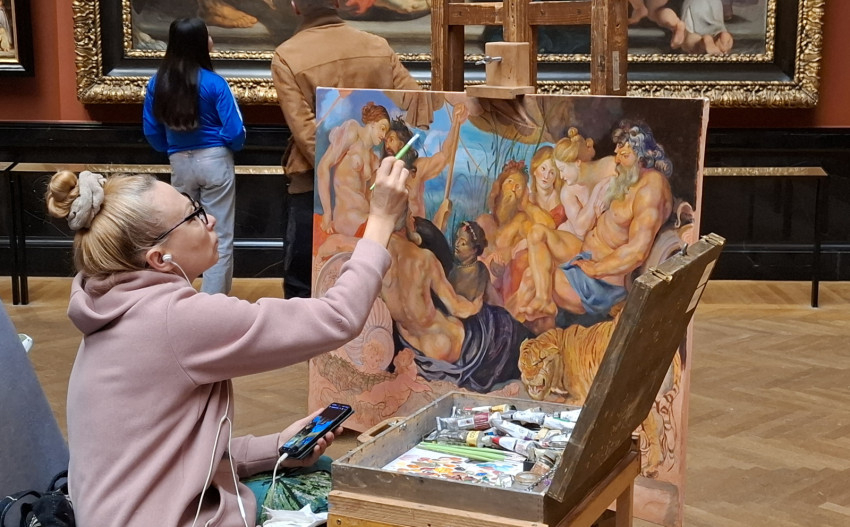 Rengeteg itt a látnivaló, amiről muszáj még beszélnünk. Hiszen egy szót sem szóltunk még Tintorettóról, Rembrandtról, Van Dyckről és Rubensről sem. Ottjártunkkor abban a teremben, ahol a Rubens-képek láthatók, egy hölgy éppen a nagy flamand mester egyik képét másolta. Felállított állványán kifeszített vászon volt, s az olajfestmény készítése láthatóan a befejezéséhez közeledett. Mint megtudtuk, az alkotó, az 1969-ben Ukrajnában született Natalya Mkrtchyan rendszeresen készít másolatokat a maga számára és a múzeumnak is. Szívesen fest portrékat, állatokat, és a zsánerképeket is szereti. Rubens-másolata jónak látszott, megfelelőek voltak a színek és a formák, s a kép arányosan lett kisebb, mint az eredeti.