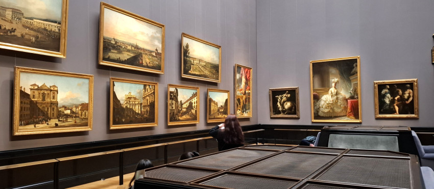 Balra az első teremben bécsi látképeket nézhetünk meg Bernardo Bellottótól, aki a híres Canaletto unokaöccse és tanítványa volt. Úgynevezett vedutákat, városképeket festett, akárcsak mestere. Az 1700-as években nem ismerték még a fényképezést, akkoriban ilyen és ehhez hasonló képeken örökítették meg a városi helyszíneket. Canaletto festményeinek többsége Velencét ábrázolja, Bellotto azonban nem csak itáliai városokat festett meg, hanem német nyelvű területeken is dolgozott. 1747-ben, huszonhat évesen II. Ágost szász választófejedelem meghívására Drezdába költözött, s itt hamar európai hírnévre tett szert. 1758-ban Mária Terézia, Ausztria uralkodó főhercegnője Bécsbe hívta. Három évvel később már Münchenben volt, öt évre rá visszatért Drezdába, majd Varsóba költözött, immár végleg. Az ott készített tájképei igen hasznosnak bizonyultak: mintául szolgáltak a város második világháborús bombázásait követő rekonstrukcióhoz.
