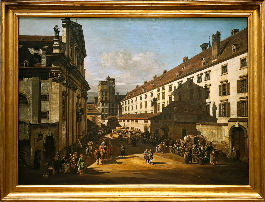 Ha közelebbről megnézzük Bellotto festményeit, láthatjuk, micsoda élet van a vásznakon. Emberek jönnek-mennek a széles tereken, hintó suhan az úton, a benne ülő arisztokratát megsüvegelik a járókelők. Egy másik képen vásározók árulják termékeiket, a piacon kereskedők kínálják portékáikat. Bernardo Bellottótól nyolc városképet láthatunk az első teremben.